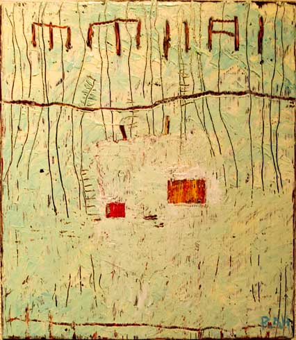 Fabuleringer " To hus " akryl/olje på tre 23 x 25 2006 solgt Ragnhild A. Holten