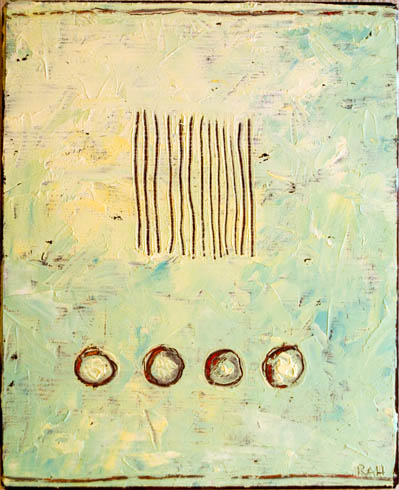 Fabuleringer " Fire steiner og et gjerde " akryl/olje på tre 21,5 x 26,5 2007 solgt Ragnhild A.Holten