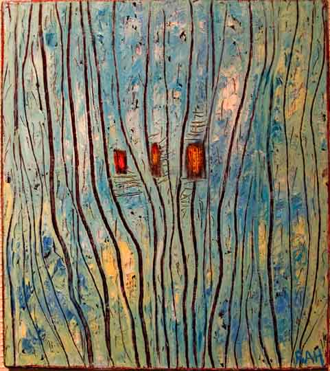 Fabuleringer " I skogen I " akryl/olje på tre 23 x 25 2006 solgt Ragnhild A. Holten