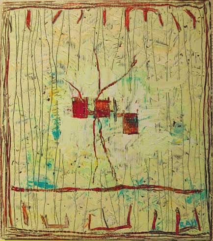 Fabuleringer " Tre hus " akryl/olje på tre 23 x 25 2006 solgt Ragnhild A. Holten